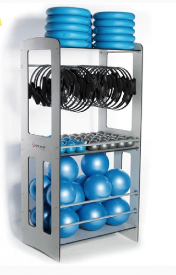 Rack de rangement compact pour une capacité de 20 ballons, 40 balles lestées, 20 pilates ring et 20 balance cushion. Il est en métal avec des panneaux en bois phénolique, résistant et facile à nettoyer.